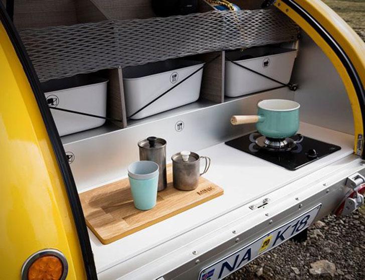 Mink has a queen size bed tucked inside. There you can sleep, nap, or watch the stars through a glass roof. It has an open-air kitchen at the back with plenty of storage space and a gas burner.