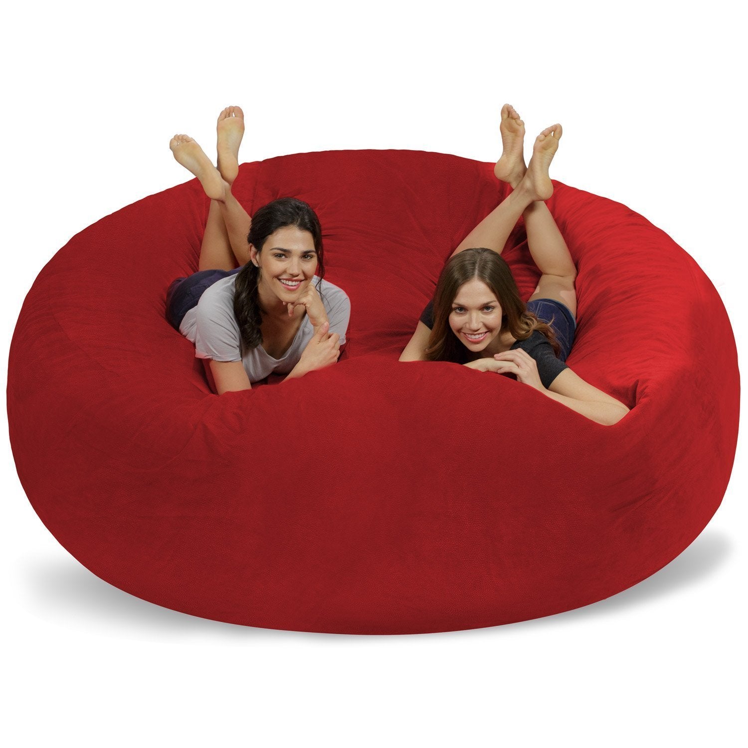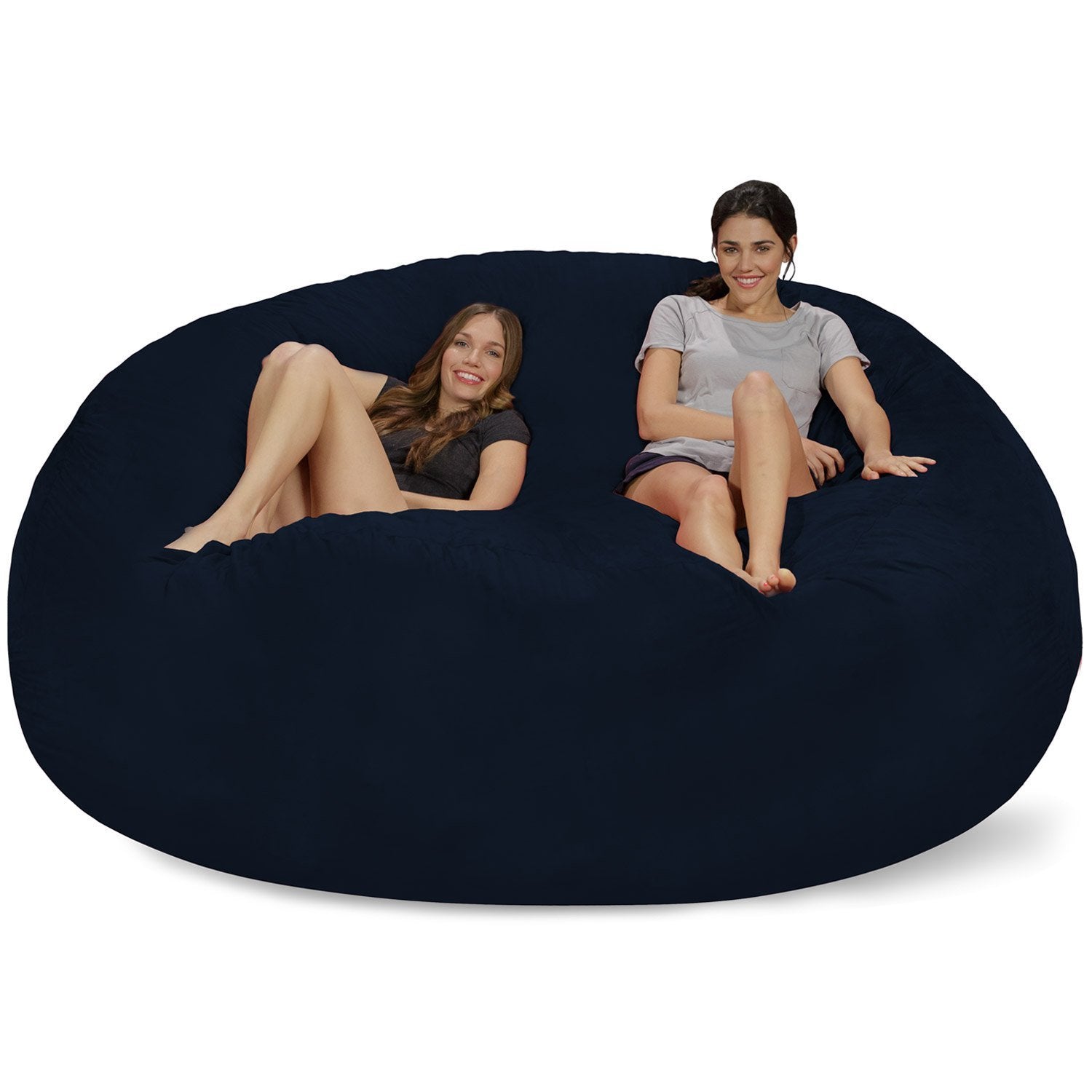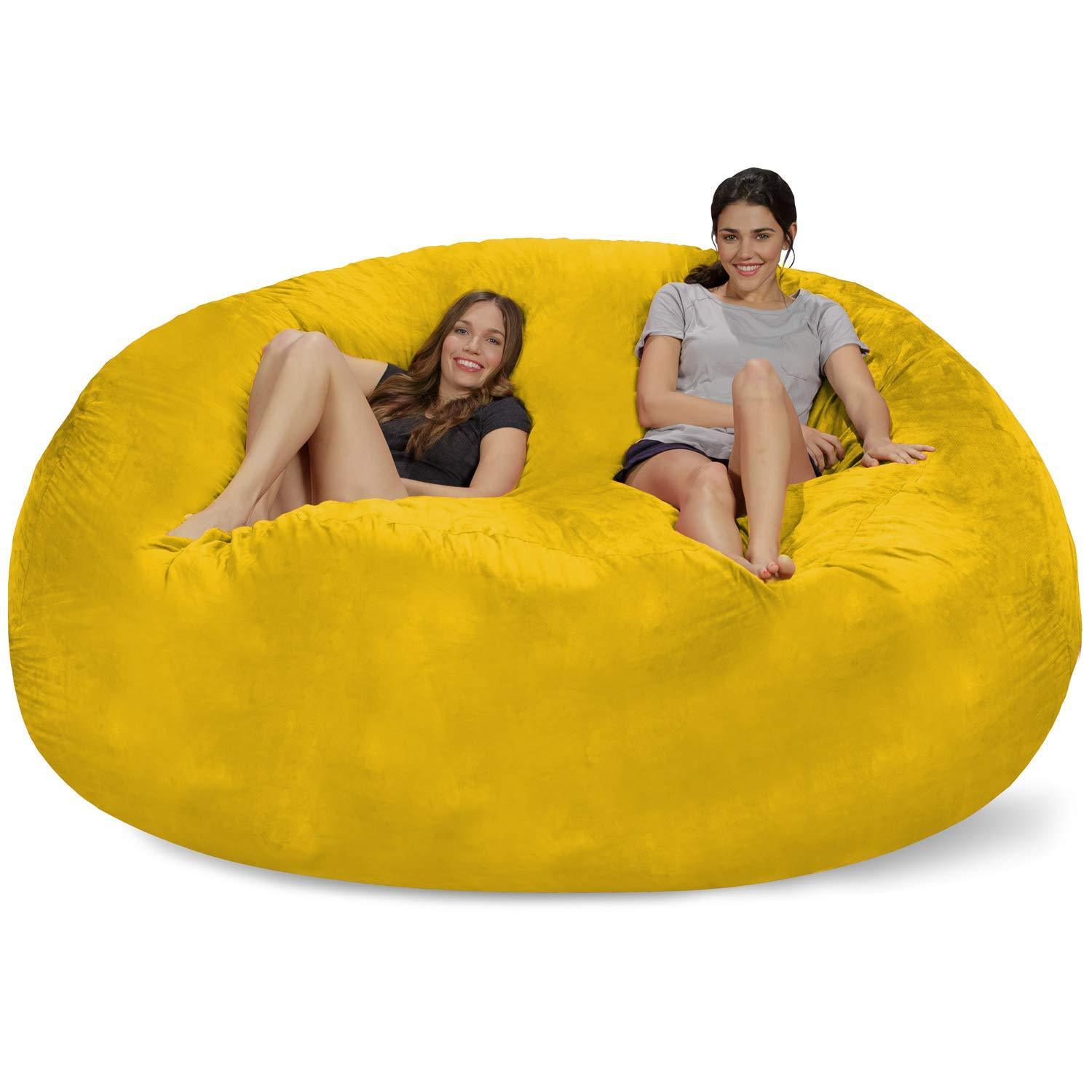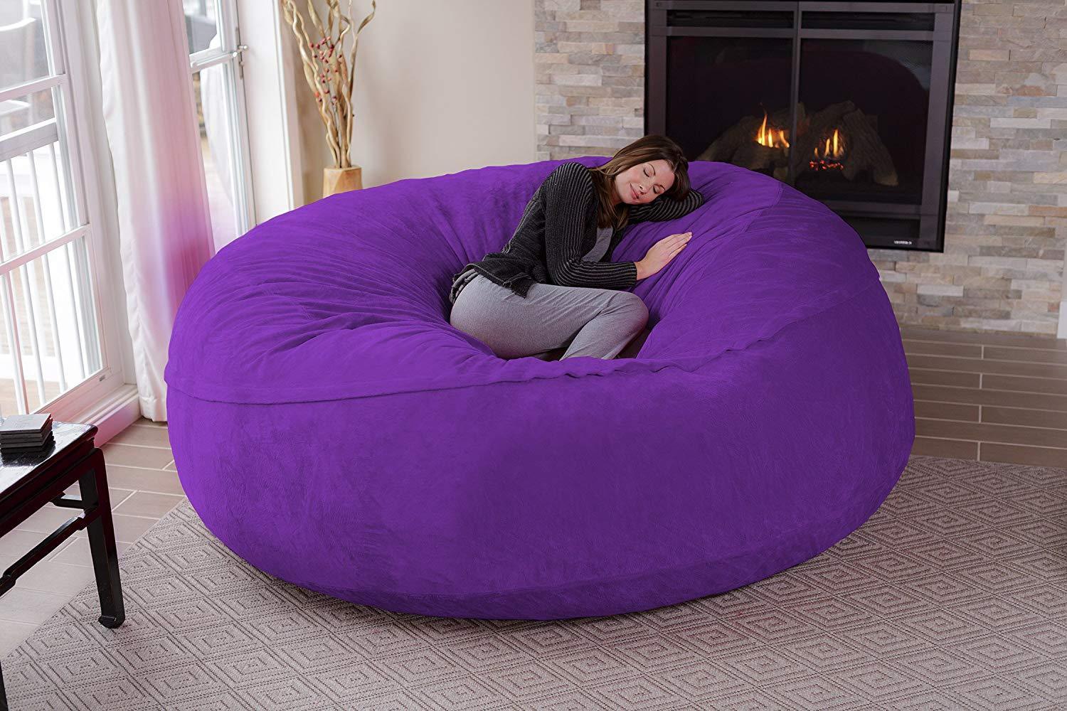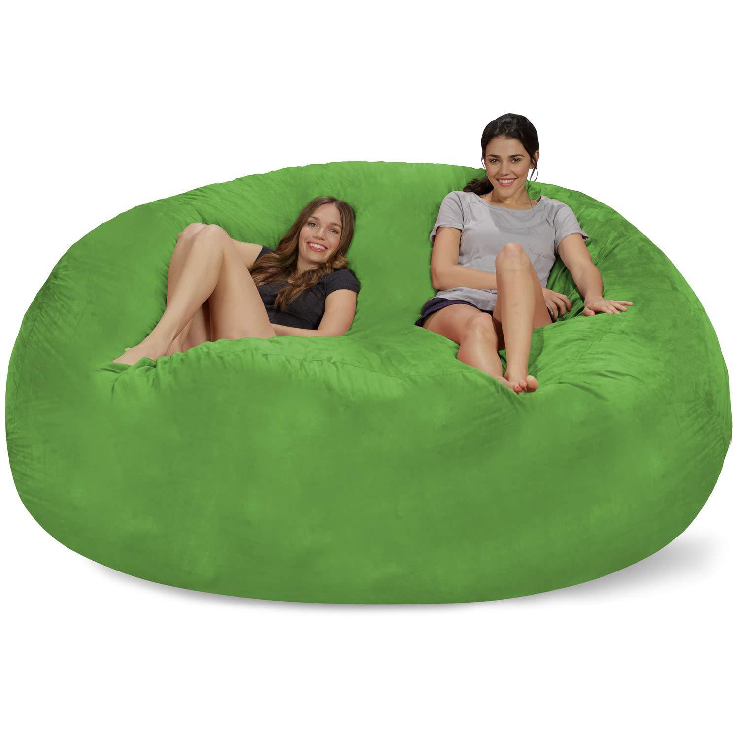 The 8 foot chill sack is double-stitched to ensure extra strength and longevity, comes in a bunch of different colors to choose from, and is perfect for a playroom, basement, kids room, or even in the living room to play video games and watch movies. When fully fluffed, the giant sack bean bag chair measures 8 feet long x 8 feet wide x 2.5 feet tall.
