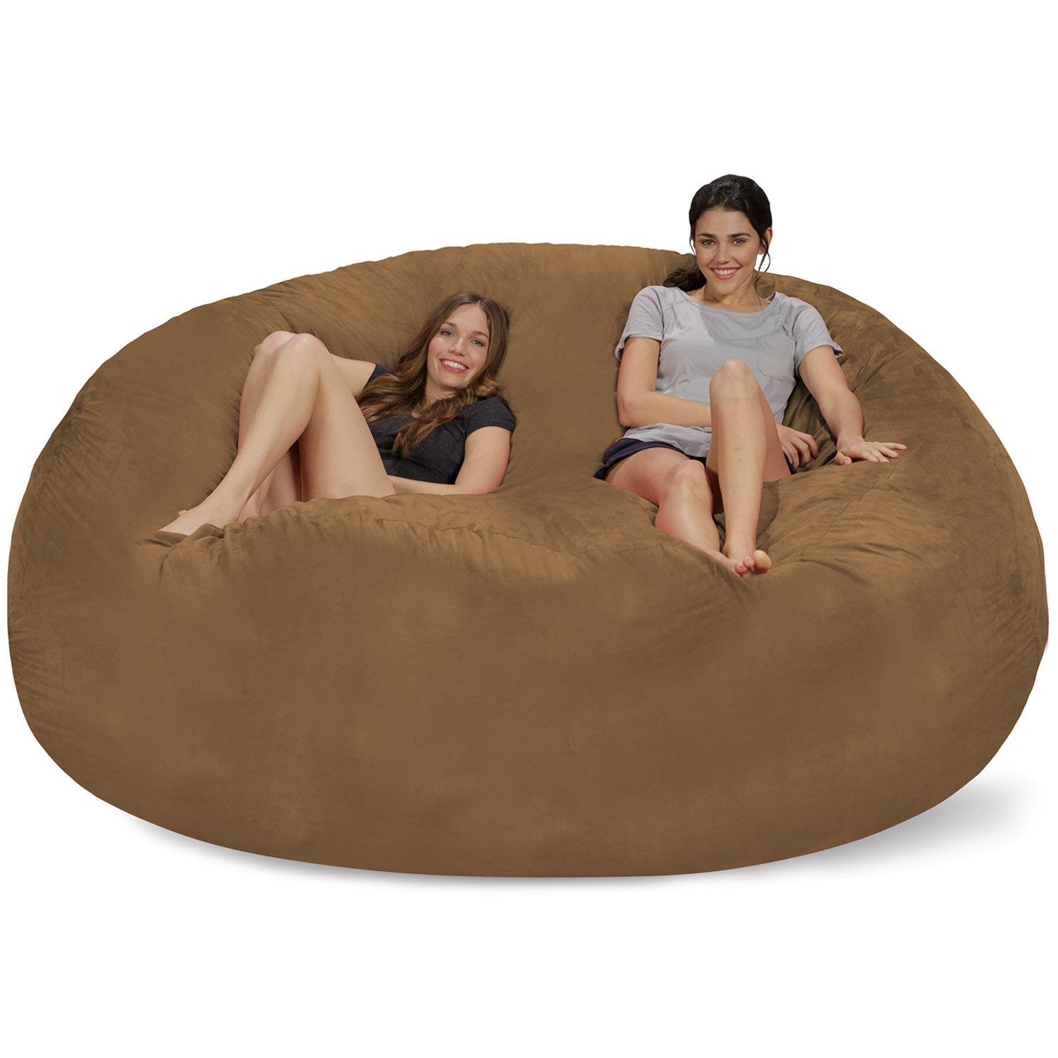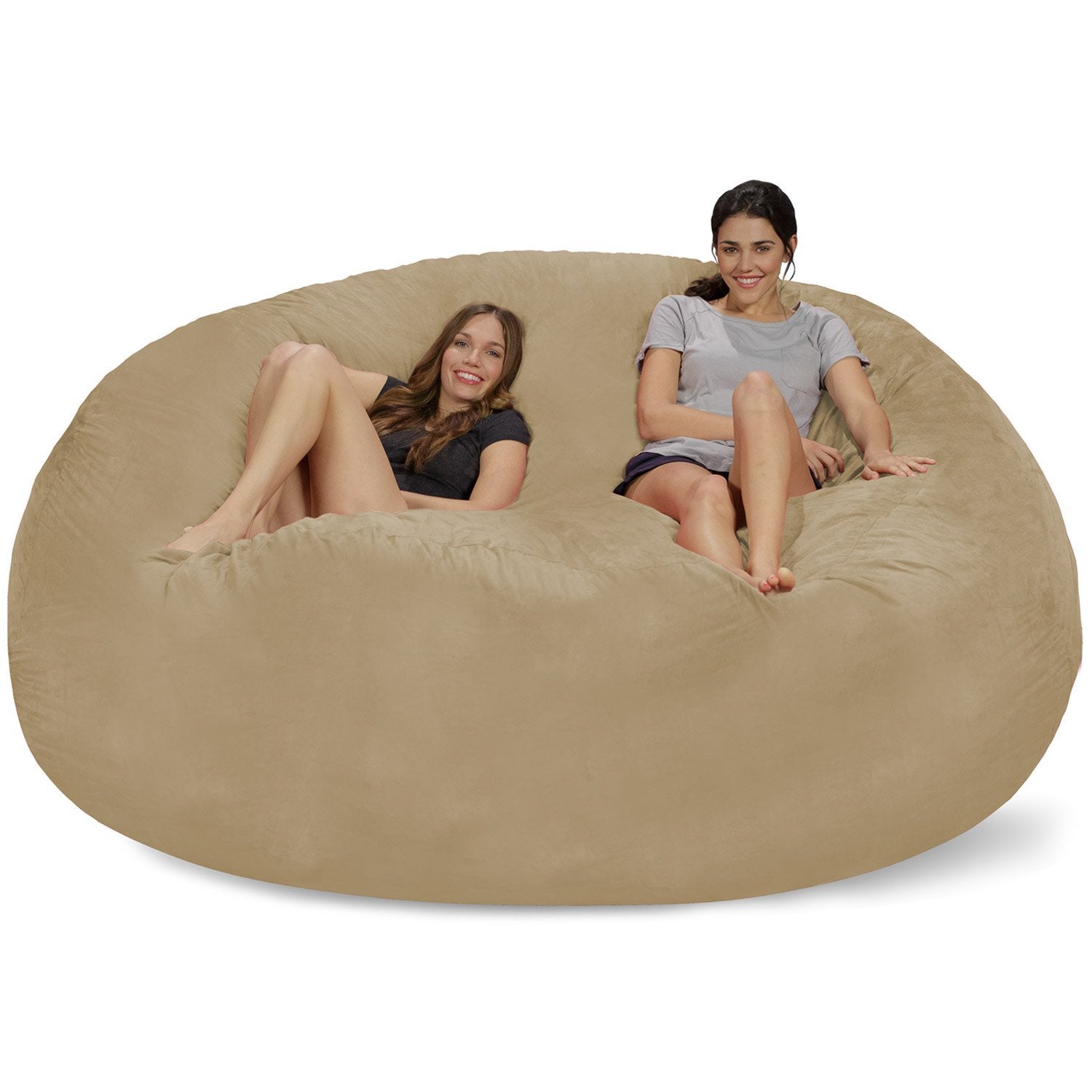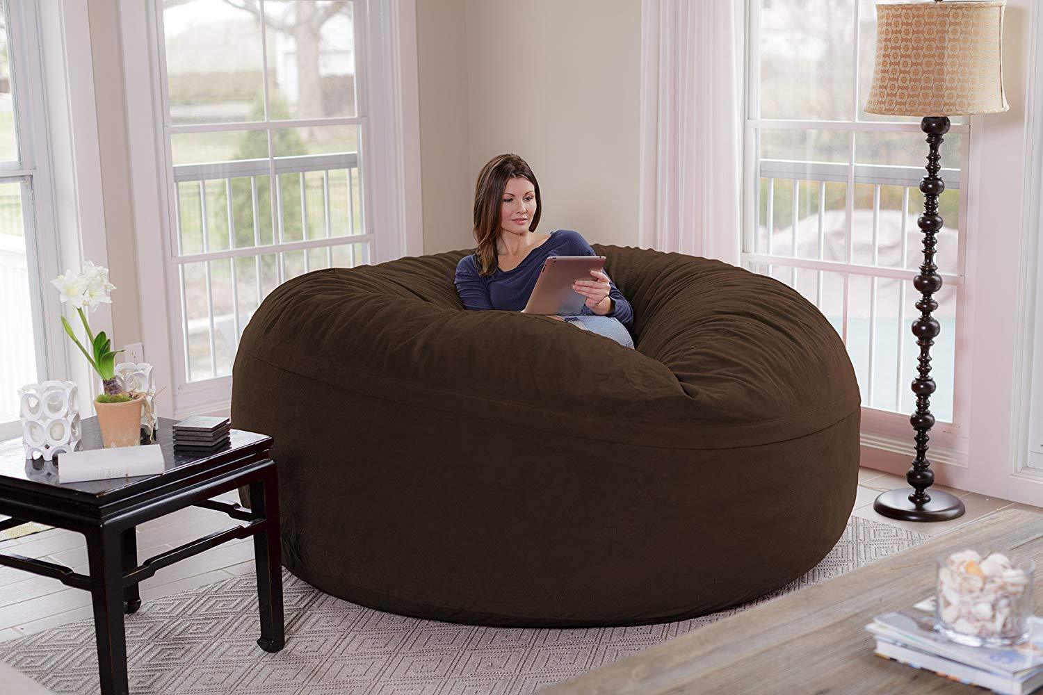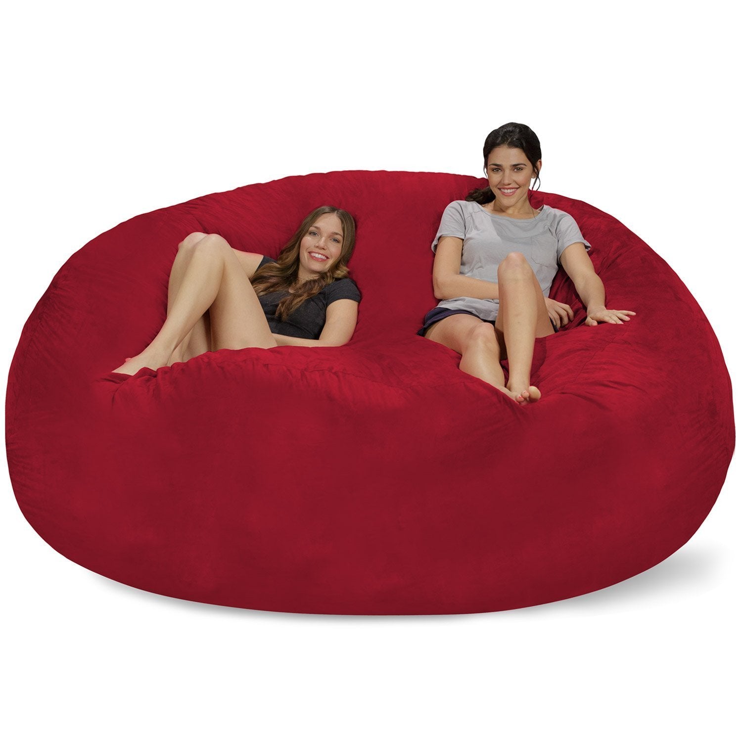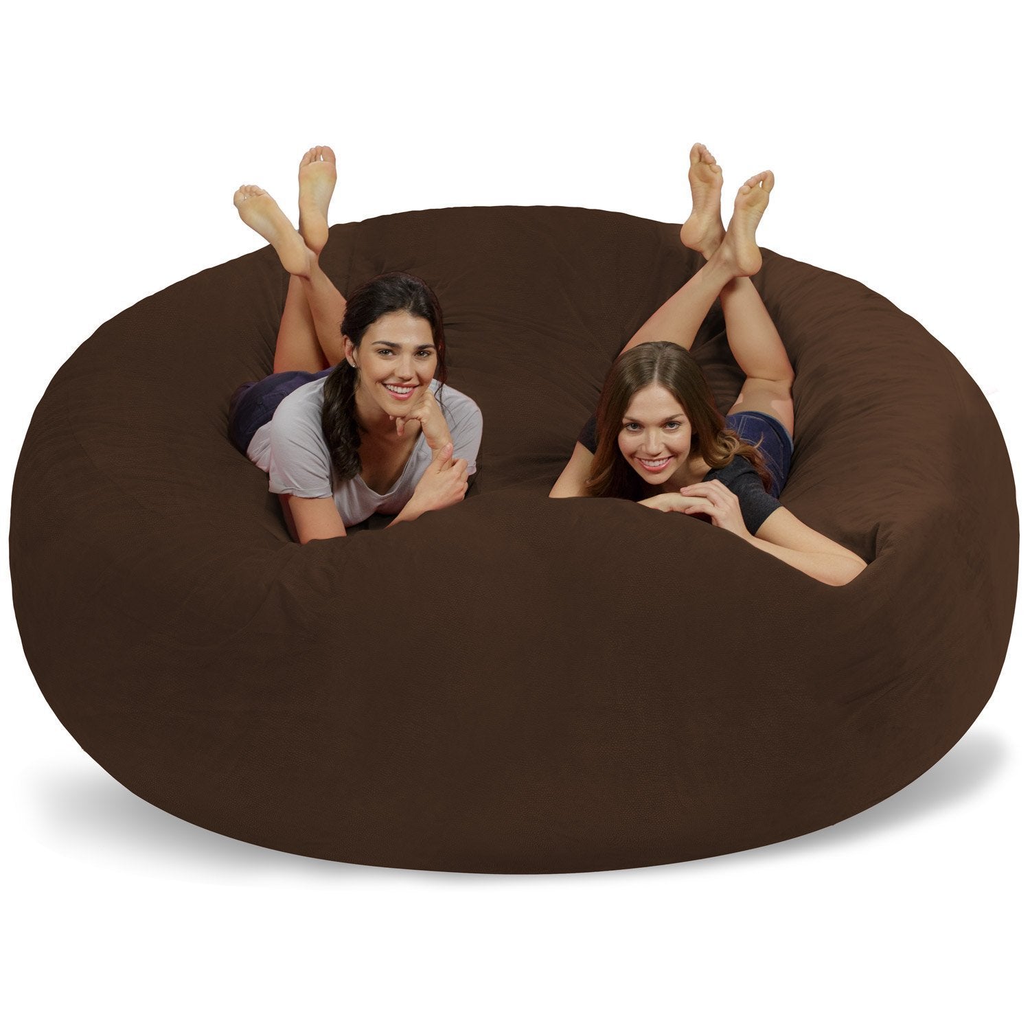 The 8 foot chill sack is double-stitched to ensure extra strength and longevity, comes in a bunch of different colors to choose from, and is perfect for a playroom, basement, kids room, or even in the living room to play video games and watch movies. When fully fluffed, the giant sack bean bag chair measures 8 feet long x 8 feet wide x 2.5 feet tall.